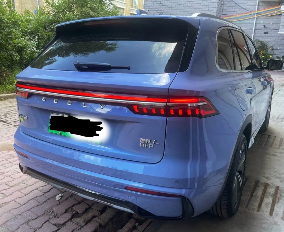 This 2023 Geely Xingyue L Hi·P 1.5T DHT Extended-Range Electric Flagship Edition was registered in May 2023, with only 1,500 km on the odometer and original paint/parts (no accident history). Finished in light purple exterior, it combines a 1.5T turbo petrol engine with a 41kWh CATL battery pack, delivering 205km pure electric range (CLTC) and 1400km combined fuel-electric range, with a hybrid fuel consumption of just 2.5L/100km.